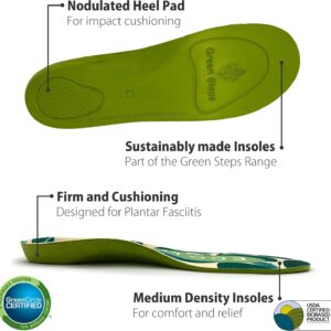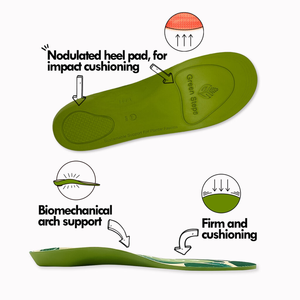 Green Steps Eco Plantar Fasciitis-inlägg kombinerar funktionellt fotstöd med en tydlig miljöprofil. Med upp till 76 % växtbaserat bioinnehåll är de ett hållbart alternativ till traditionella ortopediska sulor utan att kompromissa med komfort, stabilitet eller stöd.